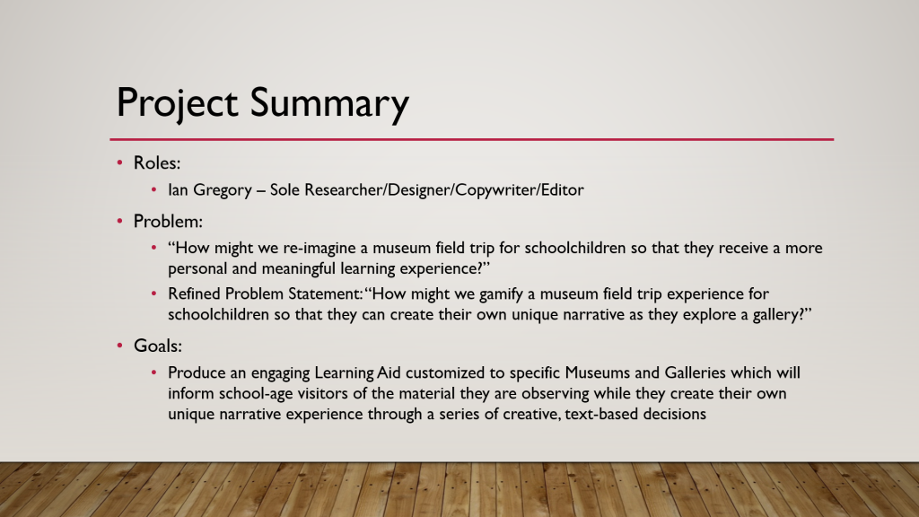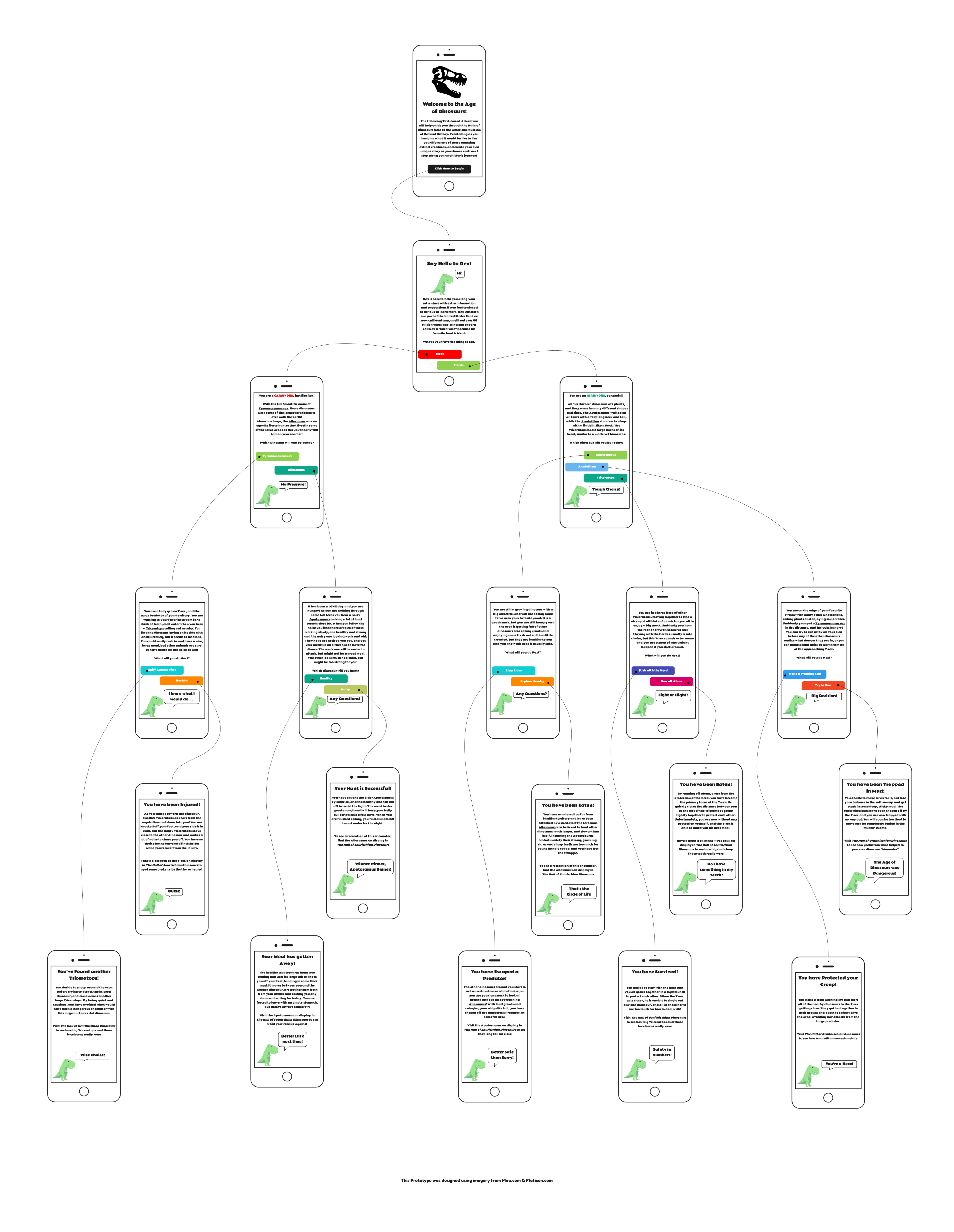 This project was undertaken in my third semester, as an individual assignment where the class was tasked with imagining a responsive app that served a specific user group. Using various research methods to best understand their needs, and utilizing principles of Emotional Design to iterate several versions, I ultimately produced a text-based mobile app to guide school-aged children through specific dinosaur exhibits of the American Museum of Natural History.